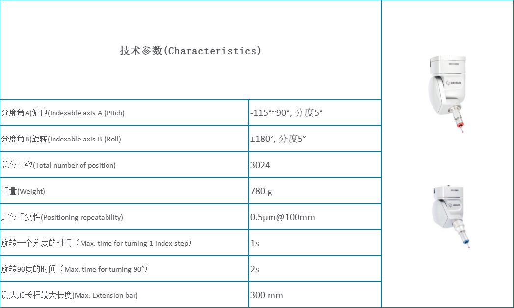 HH-A-M5可在豎直水平兩個方向自動旋轉,5°的分度確保有高達3024個測頭角度組合.旋轉90°僅需兩秒鐘,可配置長達300mm的加長桿;標配HP-TMe-SF吸盤,測針最長可接50mm